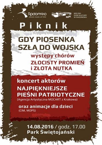 Miejski Dom Kultury w Radomsku 14 sierpnia o godz. 17.00 zaprasza na piknik do Parku Świętojańskiego. Wystąpią chóry seniorskie Złocisty Promień i Złota Nutka. W programie również koncert aktorów krakowskich ph. Najpiękniejsze Pieśni Patriotyczne oraz animacje dla dzieci.