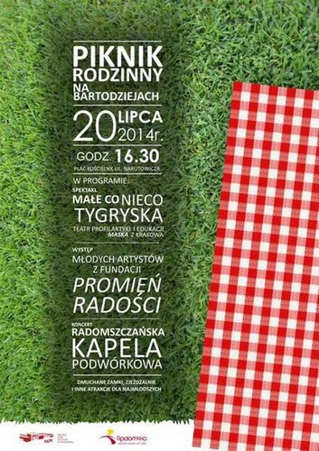 Miejski Dom Kultury w Radomsku i Miasto Radomsko zapraszają 20 lipca o godz. 16.30 na Piknik Rodzinny na Bartodziejach. W programie spektakl „Małe co nieco Tygryska” w wykonaniu Teatru Profilaktyki i Edukacji „Maska” z Krakowa, występ młodych artystów z Fundacji „Promień Radości” oraz koncert Radomszczańskiej Kapeli Podwórkowej.