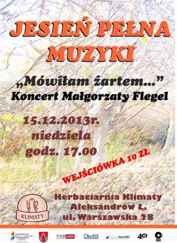 W niedzielę 15 grudnia o godz. 17.00 Partnertstwo na Rzecz Aleksandrowa Łódzkiego zaprasza do Herbaciarni Klimaty w Aleksandrowie Łódzkim na koncert Małgorzaty Flegel "Mówiłam żartem". Jest to ostatnie spotkanie z cyklu "Jesień pełna muzyki". W wykonaniu artystki usłyszymy niezapomniane piosenki Agnieszki Osieckiej.