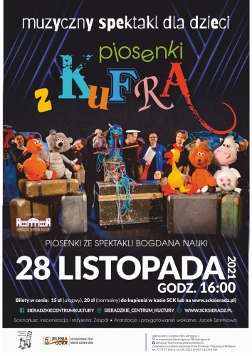 Sieradzkie Centrum Kultury zaprasza wszystkie dzieci na spektakl muzyczny „Piosenki z kufra”. Spektakl przeniesiony z 28 listopada na 23 stycznia 2022 r.