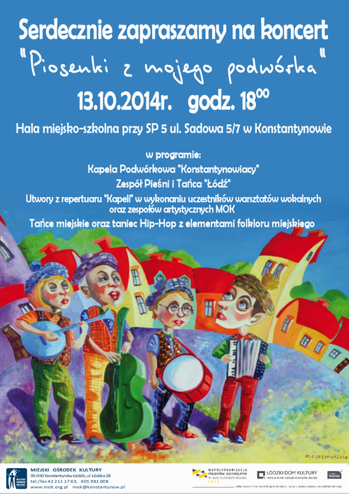 Miejski Ośrodek Kultury w Konstantynie Łódzkim zaprasza 13 października o godz. 18.00 na koncert pt: „Piosenki z mojego podwórka”, który odbędzie się w ramach Współorganizacji Projektów Kulturalnych na Terenie Województwa Łódzkiego 2014 r.