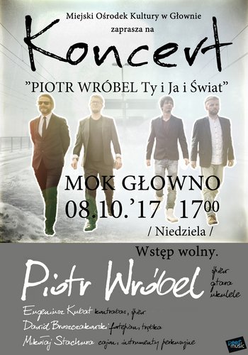 Miejski Ośrodek Kultury w Głownie 8 października o godz. 17.00 zaprasza na koncert pt. "Piotr Wróbel Ty i Ja i Swiat" w którym wystąpi kwartet w składzie: Piotr Wróbel /śpiew, gitara, ukulele/, Eugeniusz Kubat /kontrabas, spiew/, Dawid Broszczakowski /fortepian, trąbka/, Mikołaj Stachura /cajon, instrumenty perkusyjne/. Wstęp wolny!