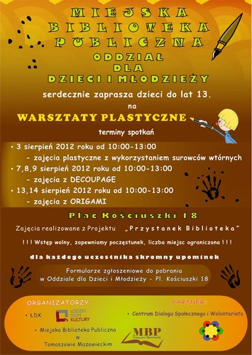 Kontynłując realizację projektu" Przystanek Biblioteka" - Organizatorzy - Miejska Biblioteka Publiczna w Tomaszowie Mazowieckim oraz Łódzki Dom Kultury zapraszają dzieciaki do 13 roku życia na warsztaty plastyczne. Warsztaty odbędą się w pierwszej połowie sierpnia.