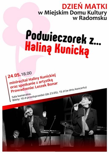 Miejski Dom Kultury w Radomsku 24 maja o godz. 18.00 zaprasza na „Podwieczorek z Haliną Kunicką”. Minikoncert i spotkanie z artystką, zorganizowane z okazji Dnia Matki poprowadzi Leszek Bonar - komentator i prezenter TVP Łódź.