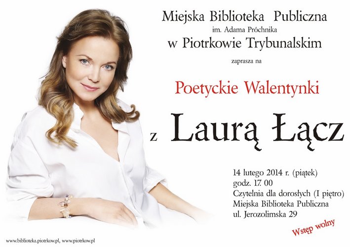 Miejska Biblioteka Publiczna im. Adama Próchnika w Piotrkowie Trybunalskim serdecznie zaprasza na wyjątkowe spotkanie z Laurą Łącz. Spotkanie wypełnione poezją Bolesława Leśmiana, Leopolda Staffa, Juliana Tuwima, Marii Pawlikowskiej-Jasnorzewskiej, Konstantego Ildefonsa Gałczyńskiego odbędzie się 14 lutego 2014 r. o godz. 17.00 w Czytelni dla dorosłych MBP w Piotrkowie Trybunalskim przy ul. Jerozolimskiej 29.