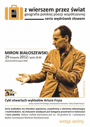 29 listopada Kutnowski Dom Kultury zaprasza na kolejny wykład z cyklu "Z wierszem przez świat - Geografia Polskiej Poezji Współczesnej". Tym razem spotkanie będzie poświęcone twórczości Mirona Białoszewskiego.
