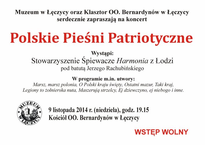 Muzeum w Łęczycy serdecznie zaprasza na koncert pieśni patriotycznych w dniu 9 listopada 2014 r. o godz. 19.15 w kościele OO. Bernardynów w Łęczycy.