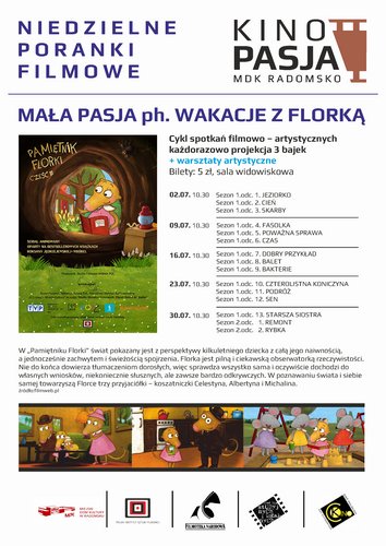 Kino Pasja w Radomsku zaprasza na Niedzielne Poranki Filmowe "Mała Pasja". W każdą wakacyjną niedzielę odbywać się będą projekcje trzech odcinków "Pamiętnika Florki" oraz warsztaty artystyczne dla dzieci. Bilety: 5zł.