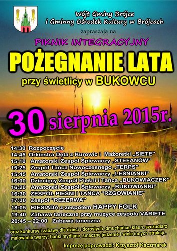 Wójt Gminy Brójce i Gminny Ośrodek Kultury w Brójcach zapraszają na Piknik integracyjny - POŻEGNANIE LATA przy świetlicy w Bukowcu (ul. Górna 29), który odbędzie się w niedzielę, 30 sierpnia 2015 r. od godz. 14:30. Na scenie zaprezentują się nasze lokalne zespoły: Orkiestra OSP z Kurowic, Zespół Mażoretki „SIETE”, Amatorskie Zespoły Śpiewacze: „Bukowianki”, „Leśnianki” i „Stefanów”, Dziecięcy Zespół Pieśni i Tańca „Bukowiaczek” i Zespół Tańca Współczesnego „TERPS”.