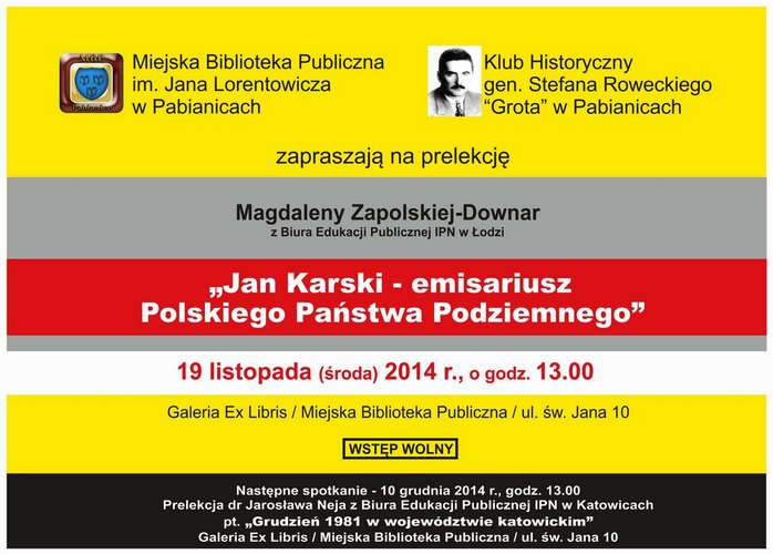 Miejska Biblioteka Publiczna im. Jana Lorentowicza w Pabianicach zaprasza 19 listopada o godz. 13.00 na prelekcję KLUBU HISTORYCZNEGO działającego Bibliotece pt.: "Jan Karski - emisariusz Polskiego Państwa Podziemnego", którą poprowadzi Magdalena Zapolska-Downar z BEP IPN w Łodzi.
