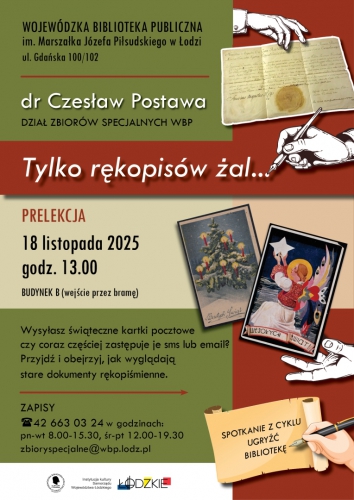 Spotkanie odbędzie się 18 listopada 2025 r. o godz. 13.00 w czytelni Działu Zbiorów Specjalnych (Łódź, ul. Gdańska 100/102, budynek B, wejście przez bramę).Czy w dobie SMS-ów i e-maili wciąż wysyłasz tradycyjne kartki świąteczne? A może z nostalgią wspominasz czasy ręcznie pisanych listów? Podczas prelekcji uczestnicy będą mieli okazję zobaczyć, jak niegdyś wyglądały dokumenty rękopiśmienne – od zapisanych liści palmowych, poprzez pergaminowe zwoje i XVI-wieczne księgi parafialne, aż po listy z królewskimi pieczęciami, korespondencję Henryka Sienkiewicza i Juliana Tuwima oraz niemal dwustuletnią bullę papieską.