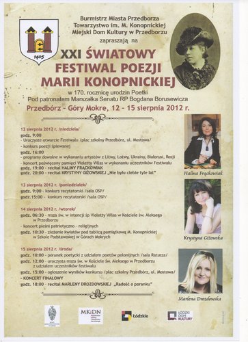 Burmistrz Miasta Przedborza, Miejski Dom Kultury w Przedborzu oraz Towarzystwo im. Marii Konopnickiej serdecznie zapraszają na XXI Światowy Festiwal Poezji Marii Konopnickiej, który odbędzie się w dn. 12 – 15 sierpnia 2012 r. w Przedborzu i Górach Mokrych.