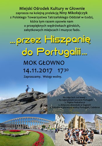 Miejski Ośrodek Kultury w Głownie 14 listopada o godz. 17.30 zaprasza na kolejną prelekcję Niny Mikołajczyk z Polskiego Towarzystwa Tatrzańskiego Oddział w Łodzi, która tym razem opowie o przepięknych wędrówkach górskich, zabytkowych miejscach i muzyce fado. Wstęp wolny!