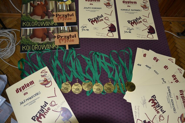Wszystkie dzieci nagrodzone i wyróżnione a także nauczycielki/instruktorki konkursu otrzymały pamiątkowe dyplomy. Pierwsze miejsca premiowane były dodatkowo medalami ufundowanymi przez MOK. Nagrodami w konkursie „Przytulam, bo lubię” przekazanymi przez głównego organizatora projektu tj. MOMAKIN w Łodzi były gry planszowe firmy Alexander, kolorowy plecak, piórnik i worek szkolny od firmy PASO, miód marki Sądecki Bartnik, a także rękawki do pływania, odblaski i kredki od Telewizji PULS oraz gadżety związane z serialem „Przytul Mnie” – kolorowanki i naklejki.