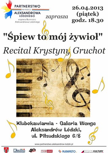 Partnerstwo Na Rzecz Aleksandrowa Łódzkiego zaprasza 26 kwietnia o godz. 18.30 na Recital Krystyny Gruchot Śpiew to mój żywioł, który odbędzie się w Klubokawiarni - Galerii Wenge w Aleksandrowie Łódzkim (ul. PIłsudskiego 6/8).