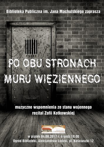 Biblioteka Publiczna im. Jana Machulskiego w Aleksandrowie Łódzkim 4 sierpnia o godz. 18.00 zaprasza na recital Zofii Kotkowskiej. Artystka przypomni, co się śpiewało i czego słuchało się w salonach opozycyjnych, w ośrodkach internowania, więzieniach i podczas działalności podziemnej. Spotkanie odbędzie się w Ogrodzie Biblioteki.