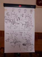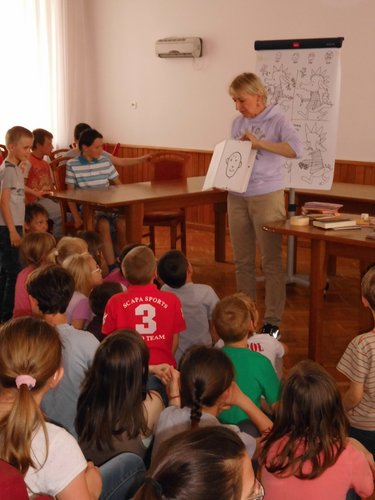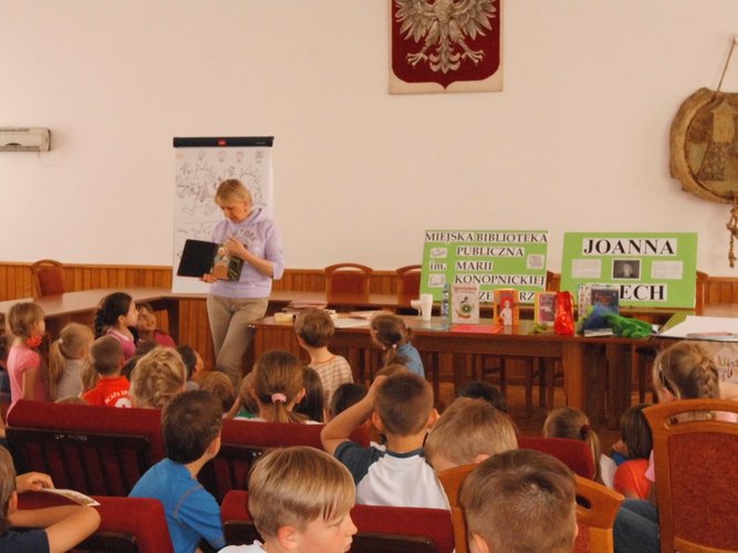 Na spotkanie przybyła liczna grupa dzieci z Zespołu Szkolno-Gimnazjalnego w Przedborzu. Podczas spotkania pani Joanna opowiedziała o sobie i swoich książkach, urządziła quiz na znajomość bohaterów swoich książek oraz konkurs wśród 3 wybranych z publiczności chłopców na to, który z nich najbardziej przypomina Miziołka - bohatera jednej z jej książek. Było bardzo wesoło, a dzieci bawiły się znakomicie wymyślając historyjki, które pani Joanna musiała narysować. Na koniec pani Joanna została otoczona przez swoich czytelników, którym rozdawała autografy i przybijała zabawne pieczątki.
