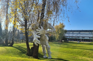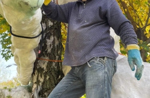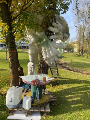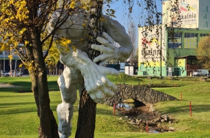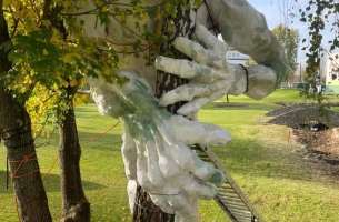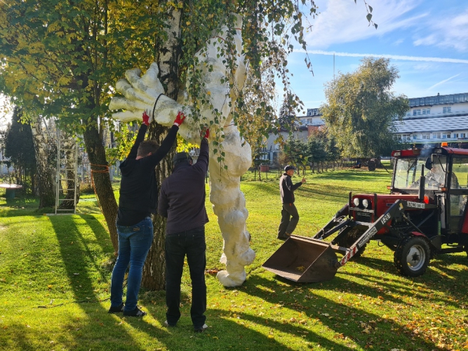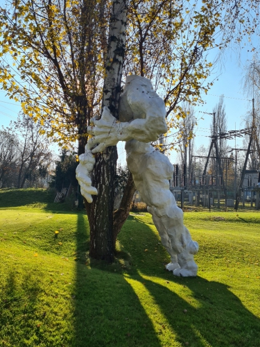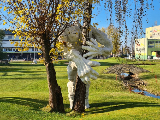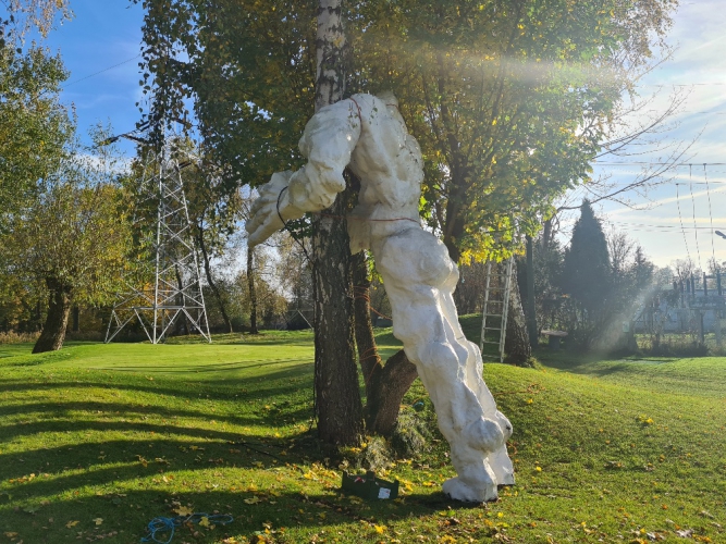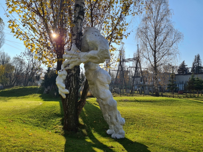 Żywioł nie oszczędza prac polskiego artysty. To już kolejny przyjazd Tomasza Koclęgi do Europejskiego Parku Rzeźby A&A, który poświęcony jest renowacji kompozycji z cyklu „Wtulonych”. Zdeformowane, białe postacie obejmujące drzewa już z daleka przyciągają wzrok i górują nad zielonym terenem. Rzeźby są częścią stałej ekspozycji parkowej. Pierwsza z nich powstała w trakcie „II Międzynarodowego Pleneru Rzeźbiarskiego”, goszczącego między innymi artystów ze Stanów Zjednoczonych i Peru w 2012 roku, druga stanęła obok rok później dopełniając kompozycję. Niestety niekorzystne warunki pogodowe ich nie oszczędzają. W lipcu ubiegłego roku jedna z nich została przygnieciona przez drzewo, które obejmowała. Potężna burza powaliła potężny okaz przyrody wraz z umocowaną przy nim rzeźbą. Druga z nich została zdemontowana przez wzgląd na eventy odbywające się regularnie na terenie parku rzeźby i pola golfowego A&A Arkadia. Uszkodzone rzeźby zostały przeniesione w bezpieczne miejsce i oczekiwały na przyjazd artysty. Niefortunnie wzbudziły zbyt duże zainteresowanie, gdyż jedna z dłoni oderwanych od rzeźby została skradziona i znalazła nowe, nieznane miejsce ekspozycji…Tomasz Koclęga, który jest twórcą robiącym dynamiczną karierę w świecie sztuki, dopiero po ponad roku wygospodarował czas na przyjazd do Pabianic. Na początek udało się dokonać renowacji jednej z rzeźb. Dzieło zmieniło przy okazji swoją lokalizację i zostało przeniesione w nowe miejsce, dzięki czemu jest lepiej widoczne nawet dla osób z zewnątrz i może stanowić zaproszenie do wejścia na teren i zwiedzenia parku rzeźby. Renowacja zajęła dwa dni i polegała na przymocowaniu rzeźby do nowego drzewa, montażu nowej dłoni oraz uzupełnieniu ubytków żywicą poliestrową, matą szklaną i pokryciu topcoatem. Drugi „Wtulony” doczeka się rekonstrukcji prawdopodobnie na wiosnę przyszłego roku. Rzeźbę w nowej lokalizacji można podziwiać od początku listopada.