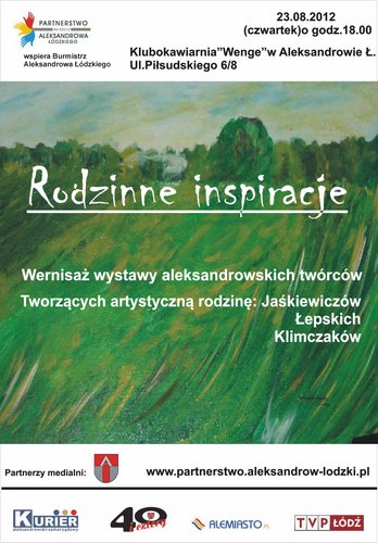 23.08.2012 (czwartek) o godz.18.00 zapraszamy do Klubokawiarni "Wenge" w Aleksandrowie (ul.Piłsudskiego 6/8) na wernisaż wystawy plastycznej "Rodzinne inspiracje". Na wystawie pokazane zostaną prace aleksandrowskich twórców z artystycznej rodziny Pana Henryka Jaśkiewicza.