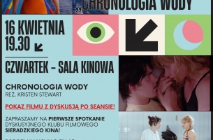 Już 16 kwietnia o godzinie 19.30 w Sali Kinowej zobaczymy film CHRONOLOGIA WODY w reż. Kristen Stewart (debiutującej w roli reżyserki, a znanej szerzej m.in. z roli Belli Swan w serii filmów ,,Zmierzch", czy roli Księżnej Diany w filmie ,,Spencer" - nominacja do Oscara).