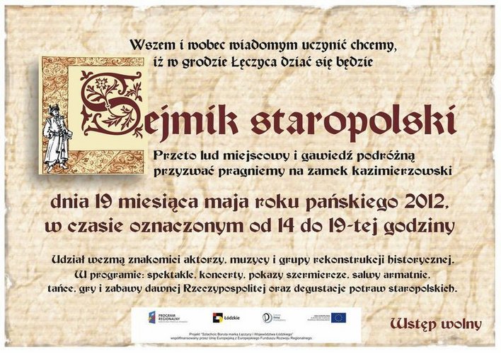 W sobotę – 19 maja w godzinach od 14.00 do 19.00 , już po raz trzeci, na dziedzińcu Zamku Królewskiego w Łęczycy odbędzie się Sejmik Staropolski. W tym roku jego forma zapowiada się niezwykle atrakcyjnie ze względu na dofinansowanie ze środków Unii Europejskiej w ramach projektu: Szlachcic Boruta marką Łęczycy i województwa łódzkiego.