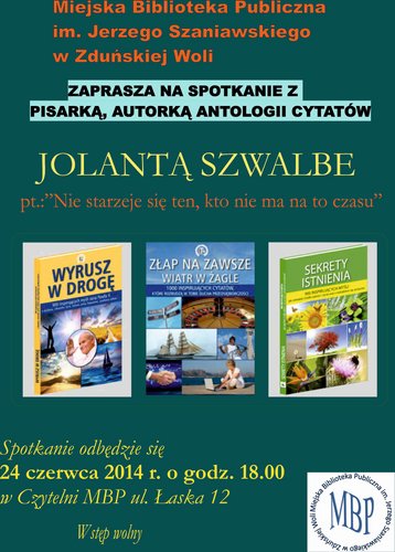 Miejska Biblioteka Publiczna im. Jerzego Szaniawskiego w Zduńskiej Woli zaprasza 24 czerwca o godz. 18.00 na spotkanie autorskie z Jolantą Szwalbe, autorką inspirujących antologii cytatów. Wstęp wolny!