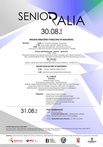 Komitet Organizacyjny czyli Klub Złota Jesień MDK Radomsko, Radomszczański Uniwersytet Trzeciego Wieku, Radomszczański Uniwersytet Trzeciego Wieku "Wiem więcej", Sekcja Emerytów i Rencistów ZNP, Związek Emerytów, Rencistów i Inwalidów w Radomsku oraz Partnerzy - Miasto Radomsko, Miejski Dom Kultury w Radomsku, Miejska Biblioteka Publiczna w Radomsku, Miejski Ośrodek Pomocy Społecznej w Radomsku zapraszają na SENIORALIA, które rozpoczną się 30 sierpnia o godz. 10.00. W programie m.in. wykłady, porady administracyjno-prawno-społeczne, koncerty, pokazy starych samochodów, porady kosmetyczne, prezentacje rękodzieła artystycznego, nieodpłatne badanie ciśnienia, poziomu cukru, degustacja radomszczańskiej zalewajki.