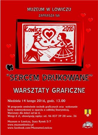 Muzeum w Łowiczu serdecznie zaprasza w niedzielę 14 lutego 2016 r. o godz. 13.00 na zajęcia pt.: "Sercem drukowane. Warsztaty graficzne". W trakcie zajęć uczestnicy zapoznają się z technikami poligraficznymi oraz wykonają kartę o tematyce walentynkowej przy użyciu odbitki linorytniczej. Warsztaty dla dzieci od lat 6.