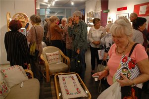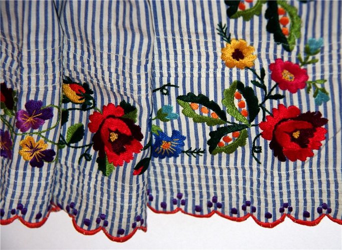 Na ekspozycji, obok dawnych haftów ze zbiorów muzealnych prezentowane są prace uczestników projektu: zarówno elementy ubioru (sukienki, tuniki, fartuszki, torebki) jak i wyroby dla domu (obrusy, serwetki, zasłonki, poduszki, zasłonki, firanki).