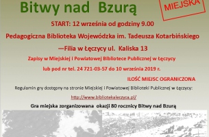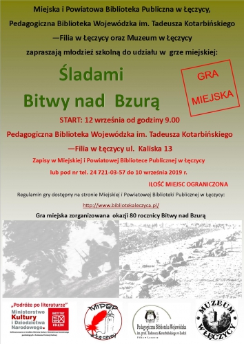 12 września młodzież szkolna będzie mogła wziąć udział w grze miejskiej „Śladami Bitwy nad Bzurą”, która odbędzie się w godzinach 9.00 – 11.30 w Łęczycy. Wydarzenie jest częścią projektu „Podróże po literaturze” dofinansowanego ze środków Ministra Kultury i Dziedzictwa Narodowego pochodzących z Funduszu Promocji Kultury i realizowanego przez Miejską i Powiatową Bibliotekę Publiczną w Łęczycy przy pomocy Muzeum w Łęczycy oraz Biblioteki Pedagogicznej w Łęczycy.