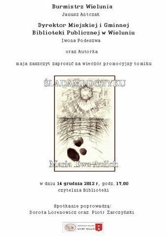 Miejska i Gminna Biblioteka Publiczna im. Leona Kruczkowskiego w Wieluniu zaprasza 14 grudnia 2012 r. o godz. 17.00 na wieczór promocyjny tomiku "Śladami dotyku" Marii Aulich. Spotkanie poprowadzą: Dorota Lorenowicz i Piotr Żarczyński.