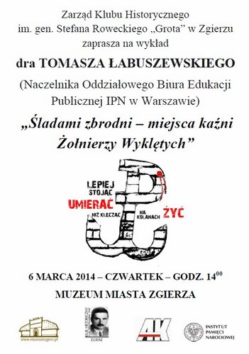 Staraniem Muzeum Miasta Zgierza, Klubu Historycznego im. gen. Stefana Roweckiego „Grota" w Zgierzu oraz Oddziału Instytutu Pamięci Narodowej w Łodzi odbędzie się spotkanie poświęcone żołnierzom wyklętym. Wykład pt. „Śladami zbrodni – miejsca kaźni Żołnierzy Wyklętych” przedstawi dr Tomasz Łabuszewski - Naczelnik Oddziałowego Biura Edukacji Publicznej IPN w Warszawie.