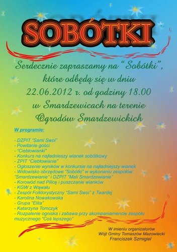 Gmina Tomaszów Mazowiecki serdecznie zaprasza na "Sobótki", które odbędą sie w dniu 22 czerwca 2012 r. od godziny 18.00 w Smardzewicach na terenie Ogrodów Smardzewickich.