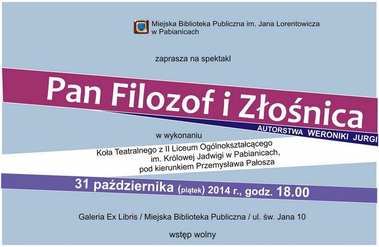 Miejska Biblioteka Publiczna im. Jana Lorentowicza w Pabianicach zaprasza 31 października o godz. 18.00 na spektakl "Pan Filozof i Złośnica" w wykonaniu II LO w Pabianicach.