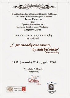 Miejska i Gminna Biblioteka Publiczna im. Leona Kruczkowskiego w Wieluniu oraz Gimnazjum nr 3 im. Ireny Sendlerowej w Wieluniu zapraszają 13.02. (czwartek) 2014 r., o godz 17.00 na spektakl "...można odejść na zawsze, by stale być blisko" (ks. Jan Twardowski). Spektakl poświęcony patronce szkoły Irenie Sendlerowej odbędzie się w czytelni Biblioteki. Wstęp wolny.