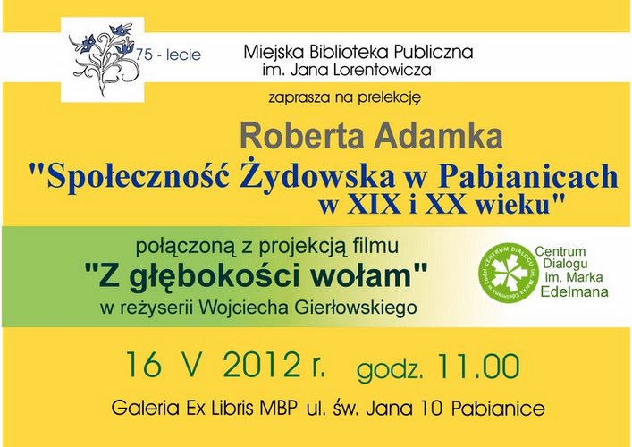 Miejska Biblioteka Publiczna w Pabianicach zaprasza 16 maja o godz. 11.00 na prelekcję pana Roberta Adamka z pabianickiego Muzeum. Spotkanie będzie związane z projekcją filmu dokumentalnego o łódzkim gettcie pt."Z głębokości wołam" w reżyserii Wojciecha Gierłowskiego.