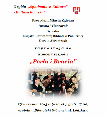 17 września o godz. 17.00 w czytelni Biblioteki Głównej w Zgierzu odbędzie się koncert z cyklu "Spotkania z kulturą" - wystąpi zespół "Perła i Bracia" wykonujący romską muzykę wokalno - instrumentalną.