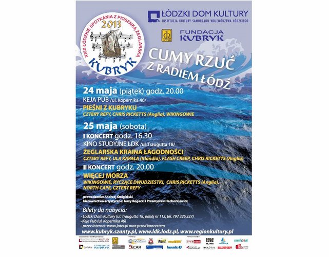 25 maja 2013 r. w Kinie Studyjnym ŁDK odbędą się XXIX Łódzkie Spotkania z Piosenką Żeglarską KUBRYK’ 2013.