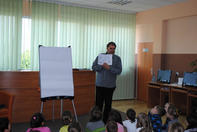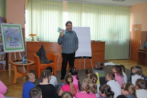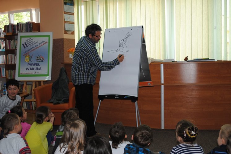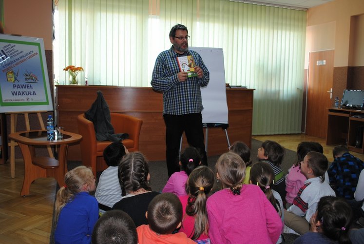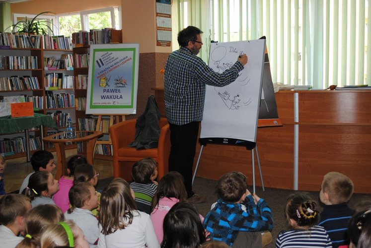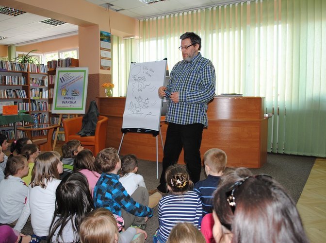 Paweł Wakuła to absolwent malarstwa i pedagogiki artystycznej. Uprawia niepoważny - jak sam mówi, zawód rysownika - humorysty. Od lat związany jest z tygodnikiem „Angora” oraz popularnym dodatkiem dla dzieci – „Angorką”. W 2007 roku jego książka pt.: „Co w trawie piszczy” została wyróżniona w Konkursie Literackim im. Astrid Lindgren, natomiast książka pt.: „Kajtek i Yetik” została nominowana do Nagrody Literackiej im. Kornela Makuszyńskiego. Podczas spotkania autor opowiadał o kulisach pracy rysownika, o własnych książkach i historiach ich powstania jednocześnie rysując bohaterów swoich opowieści za pomocą jednego ze swych ulubionych narzędzi – pisaka. W swoje opowiadania wplatał ponadto legendy a także gawędy o chochlikach, nimfach, leśnych lichach, żabonach, rusałkach i innych stworkach występujących w jego książkach .