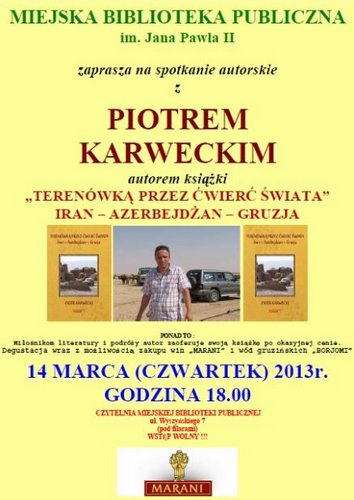 W czwartek, 14 marca w czytelni Miejskiej Biblioteki Publicznej im. Jana Pawła II w Rawie Mazowieckiej o godz. 18 rozpocznie się spotkanie z Piotrem Karweckim, autorem książki "Terenówką przez ćwierć świata. Iran - Azerbejdżan - Gruzja". W programie pokaz fotografii w formie slajdów z komentarzem autora, możliwość zakupu książki z dedykacją po okazyjnej cenie, wystawa okolicznościowa pt. „Literatura podróżnicza”. Zaplanowano również degustację win i wód gruzińskich „Marani”. Wstęp wolny.