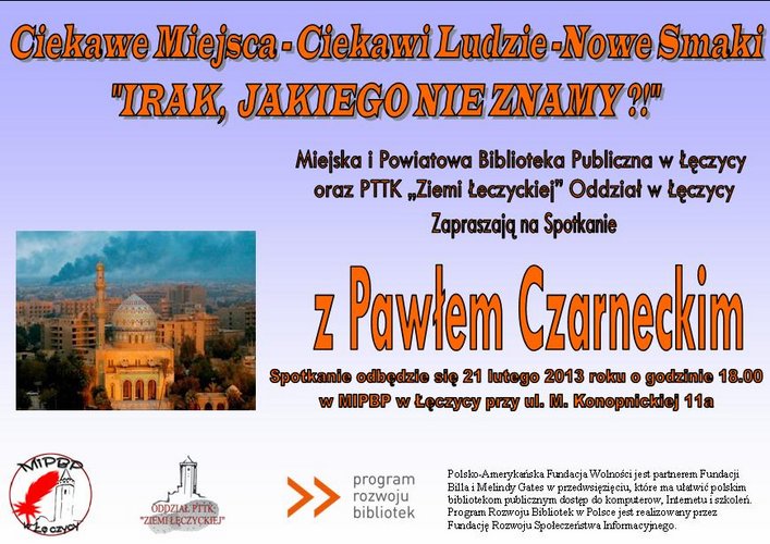 Zapraszamy na spotkanie "Irak jakiego nie znamy", na którym Paweł Czarnecki, opowie o tym egzotycznym kraju. Spotkanie rozpocznie się 21 lutego 2013 r. o godzinie 18.00 w MiPBP w Łęczycy. Realizujemy je w ramach projektu „Ciekawe miejsca – Ciekawi ludzie – Nowe smaki” czyli cykl spotkań z podróżnikami. Poznamy ten ciekawy kraj również przez degustację charakterystycznych dla niego potraw. Projekt jest realizowany wspólnie z PTTK „Ziemia Łęczycka”.