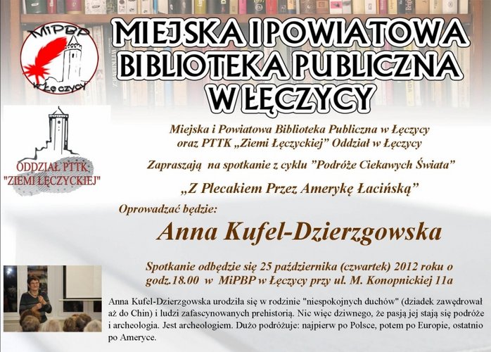 Miejska i Powiatowa Biblioteka Publiczna w Łęczycy oraz PTTK „Ziemi Łęczyckiej” Oddział w Łęczycy zapraszają na spotkanie z cyklu „Podróże ciekawych świata” z podróżniczką i archeolog panią Anną Kufel-Dzierzgowską. Spotkanie odbędzie się 25 października (piątek) 2012 roku o godz.18.00
