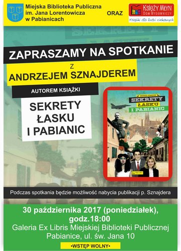 Miejska Biblioteka Publiczna im. Jana Lorentowicza w Pabianicach 30 paździenika o godz. 18.00 zaprasza na spotkanie z Andrzejem Sznajderem, absolwentem łódzkiej germanistyki, autorem m.in. "Sekretów Sieradza i Zduńskiej Woli". Podczas spotkania będzie promował swoją najnowszą książkę "Sekrety Łasku i Pabianic". Wstęp wolny!