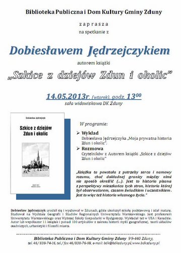 Biblioteka Publiczna i Dom Kultury Gminy Zduny zapraszają na spotkanie z Dobiesławem Jędrzejczykiem, autorem książki „Szkice z dziejów Zdun i okolic”, które odbędzie się 14 maja 2013r., o godzinie 13.00 (sala widowiskowa DK).
