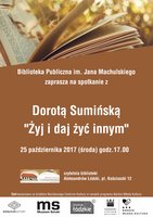 Biblioteka Publiczna im. Jana Machulskiego w Aleksandrowie Łodzkim 25 października o godz. 17.00 zaprasza na spotkanie z Dorotą Sumińską "Żyj i daj żyć innym". Spotkanie odbędzie się w Czytelni Biblioteki w ramach ramach projektu „Co piszczy w Aleksandrowie”. Prowadzący: Anna Groblińska.