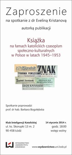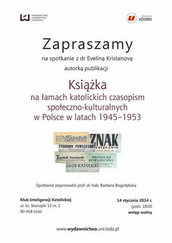Wydawnictwo Uniwersytetu Łódzkiego zaprasza 14 stycznia o godz. 18.00 na spotkanie z Eveliną Kristanovą, autorką publikacji "Książka na łamach katolickich czasopism społeczno-kulturalnych w Polsce w latach 1945-1953", które odbędzie się w Klubie Integracji Katolickiej w Łodzi. Wstęp wolny!