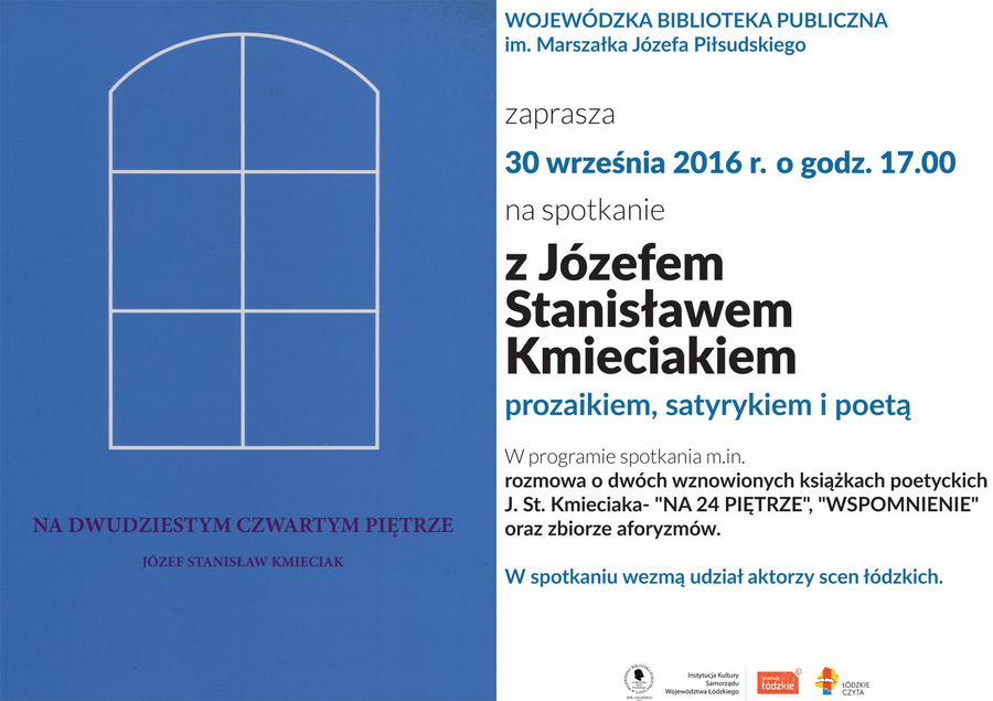 Wojewódzka Biblioteka Publiczna im. Marszałka Józefa Piłsudskiego w Łodzi 30 września o godz. 17.00 zaprasza na spotkanie z Józefem Stanisławem Kmieciakiem – prozaikiem, satyrykiem i poetą. W programie spotkania m. in. rozmowa o dwóch wznowionych książkach poetyckich: „Na 24 piętrze” i „Wspomnienie” oraz o zbiorze aforyzmów. W spotkaniu wezmą udział aktorzy scen łódzkich. Wstęp wolny!