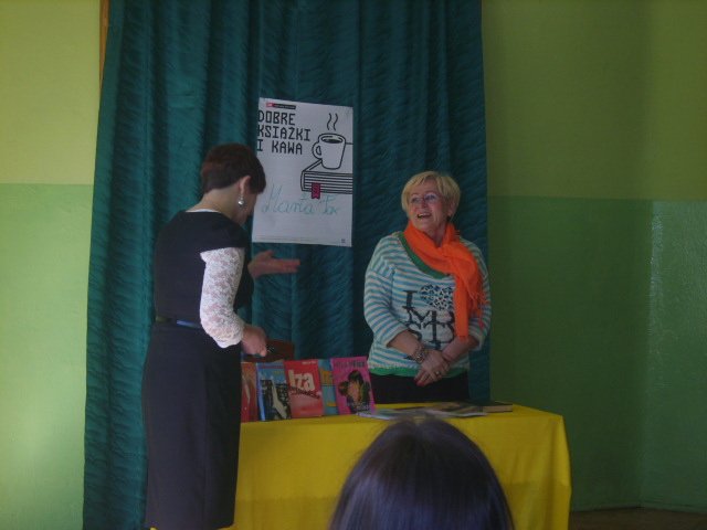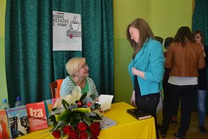 Warto było czekać, gdyż nasz gość, to bardzo otwarta i sympatyczna kobieta. Dała się poznać się jako osoba zdolna, niesamowicie oczytana, pracowita i prawdziwa w tym co robi, mówi, pisze. Nie tylko pięknie opowiada o swojej twórczości, ale również odsyła i zachęca do czytania innych twórców. Szybko nawiązała kontakt z publicznością i niesamowicie nas zainteresowała tym co mówi, o czym świadczyło skupienie i cisza na sali , a było tam przecież kilkudziesięciu gimnazjalistów.