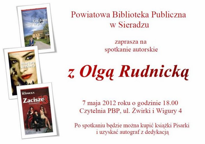 Powiatowa Biblioteka Publiczna w Sieradzu zaprasza na spotkanie z pisarką Olgą Rudnicką - autorką książek: "Martwe Jezioro", "Czy ten rudy kot to pies", "Zacisze 13", "Lilith", "Natalii 5". Spotkanie odbędzie się 7 maja 2012 r. o godz. 18.00 w czytelni PBP (ul. Żwirki i Wigury 4).