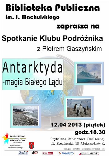 "Antarktyda-magia Białego Lądu" - spotkanie z Piotrem Gaszyńskim, 12 kwietnia 2013 (piątek) godz.18.30; Czytelnia Biblioteki Publicznej im.Jana Machulskiego, Aleksandrów Łódzki, pl. Kościuszki 12.